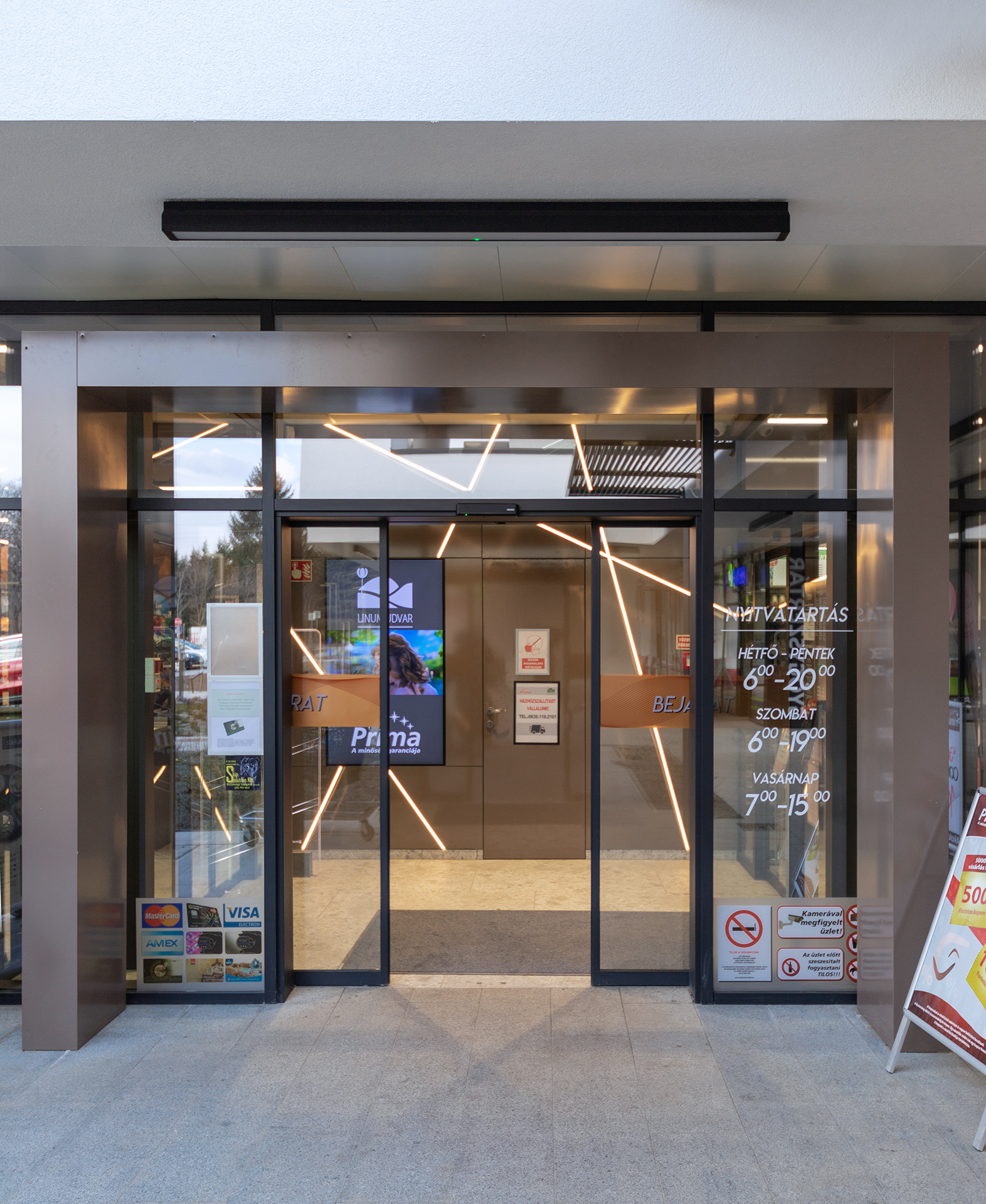 Automatikus működésű tolóajtók és teleszkópos ajtók gyártása és beépítése a Nagykovácsiban található LINUM Udvar bevásárlóközpont számára.